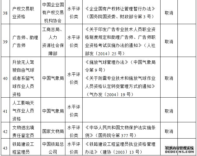 一、取消的专业技术人员职业资格许可和认定事项(共计43项,其中准入类5项,水平评价类38项)