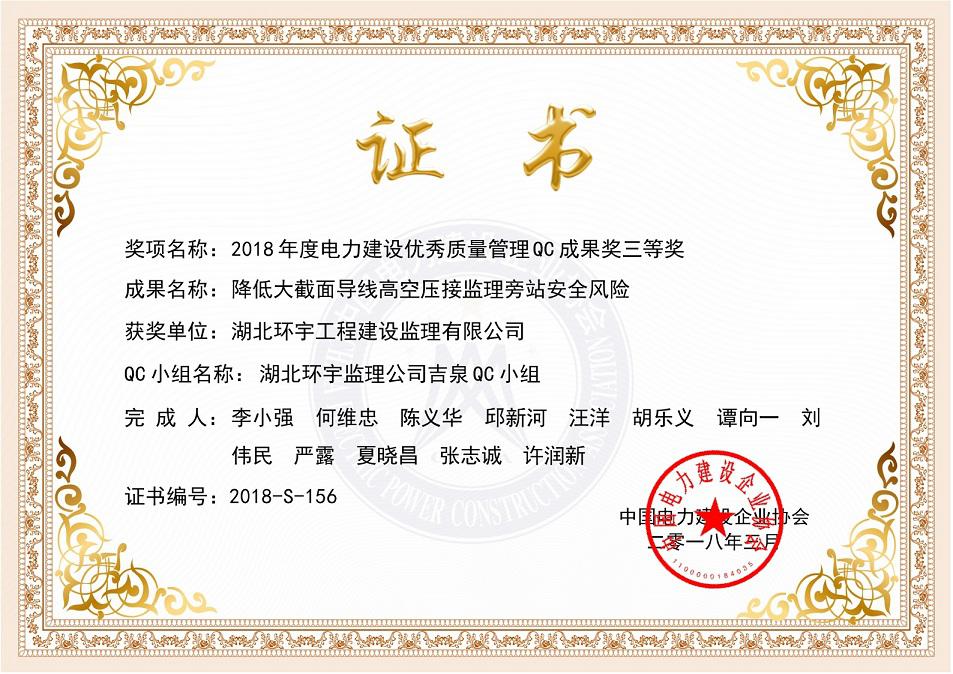 (通讯员:张志诚)3月26日,2018年中电建协QC成果比赛最终结果揭晓,湖北环宇监理FH在线平台(中国)官网发布的4项QC成果3项获奖。其中“降低1250mm²大截面导线高空压接监理旁站安全风险”、“实行区域主体责任化加强现场