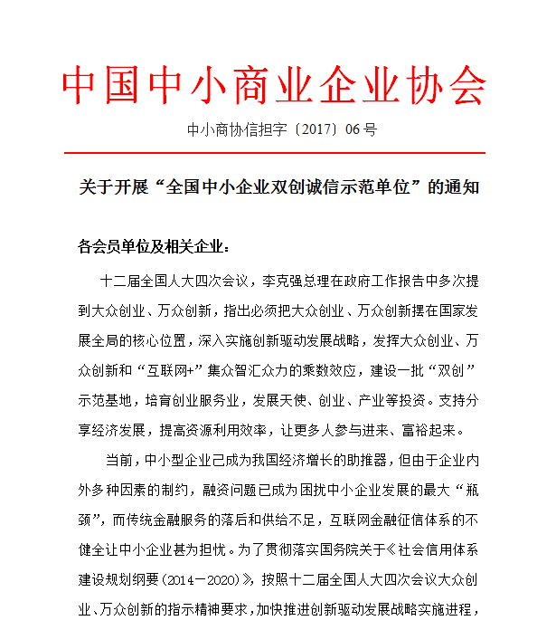 关于开展“全国中小企业双创诚信示范单位”的通知
